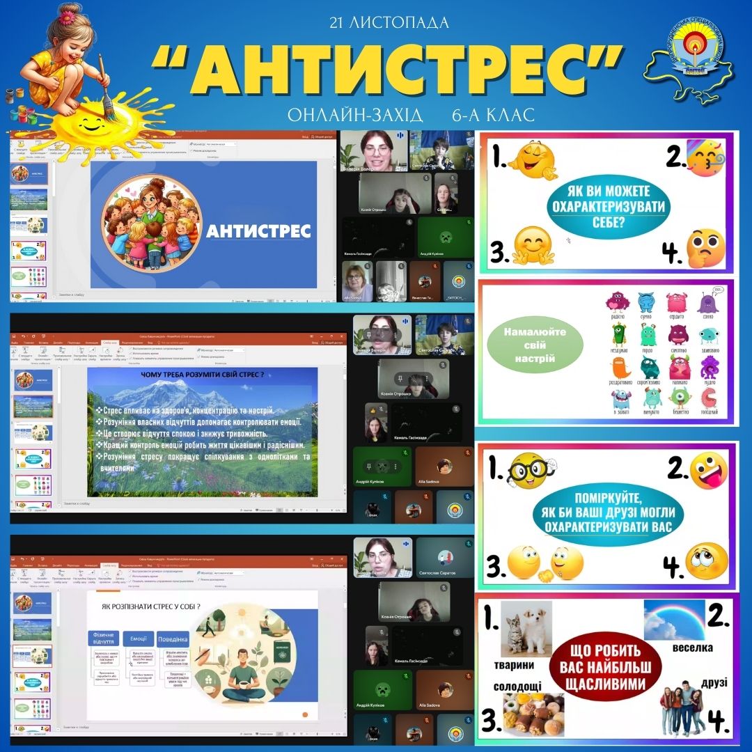 Сьогодні у школі “Світоч” відбулася важлива та цікава онлайн-зустріч для 6-х класів на тему “Антистрес”! Захід провела психолог Валерія Анатоліївна Дергоєр, яка навчила учнів ефективним і веселим методам боротьби зі стресом.