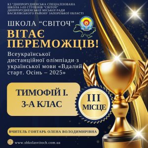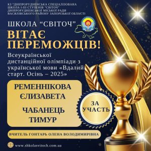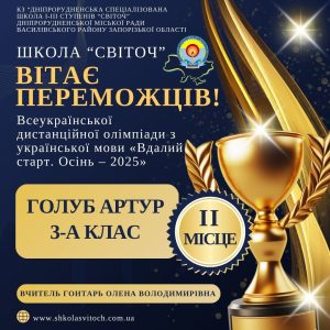 Учні 3-А класу прийняли активну участь у Всеукраїнській дистанційній олімпіаді з української мови «Вдалий старт. Осінь – 2025» та отримали такі дипломи: