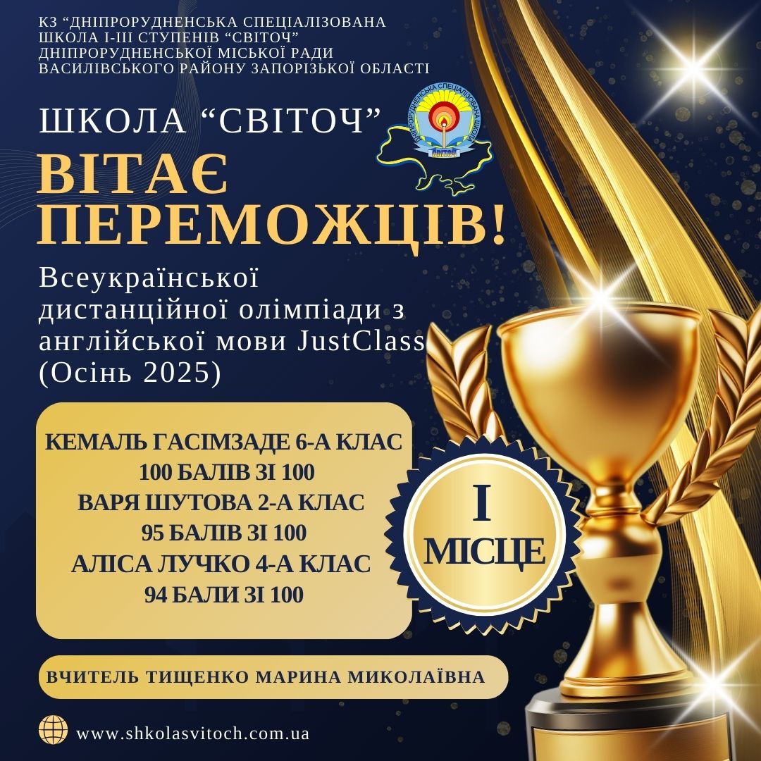 Наші учні взяли участь у Всеукраїнській шкільній онлайн-олімпіаді з англійської мови JustClass (Осінь 2025) і підкорили найвищі бали: