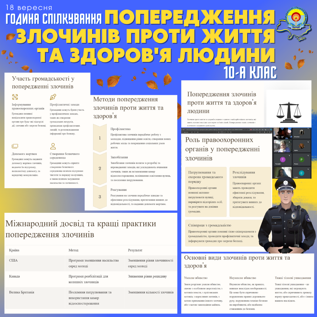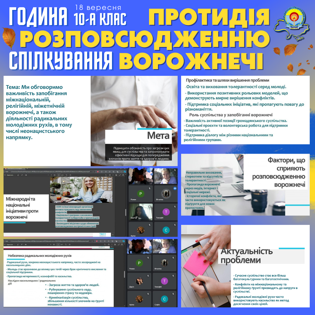 Учні 10-А класу провели змістовну годину спілкування, присвячену важливій темі: “Протидія розповсюдженню міжнаціональної, релігійної та міжетнічної ворожнечі, пропаганди насильства та діяльності радикальних молодіжних рухів і груп, зокрема неонацистського спрямування, а також попередження злочинів проти життя та здоров’я людини”.