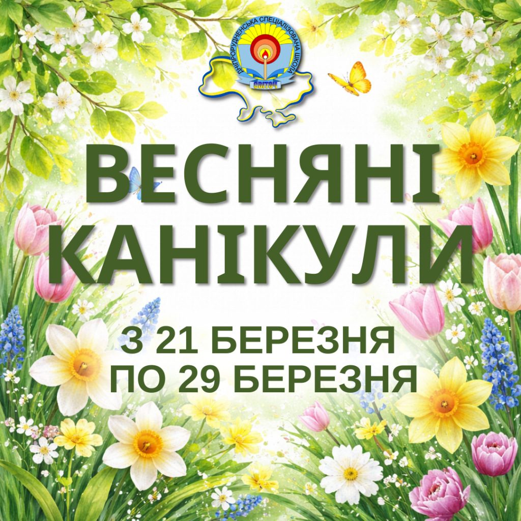 З 21 до 29 березня розпочинаються весняні канікули. Це чудовий час, щоб добре відпочити, насолодитися першими весняними квітами, яскравим сонечком та довгоочикуваним теплом. Нехай ці дні принесуть лише приємні враження та відновлять сили для подальшого навчання.