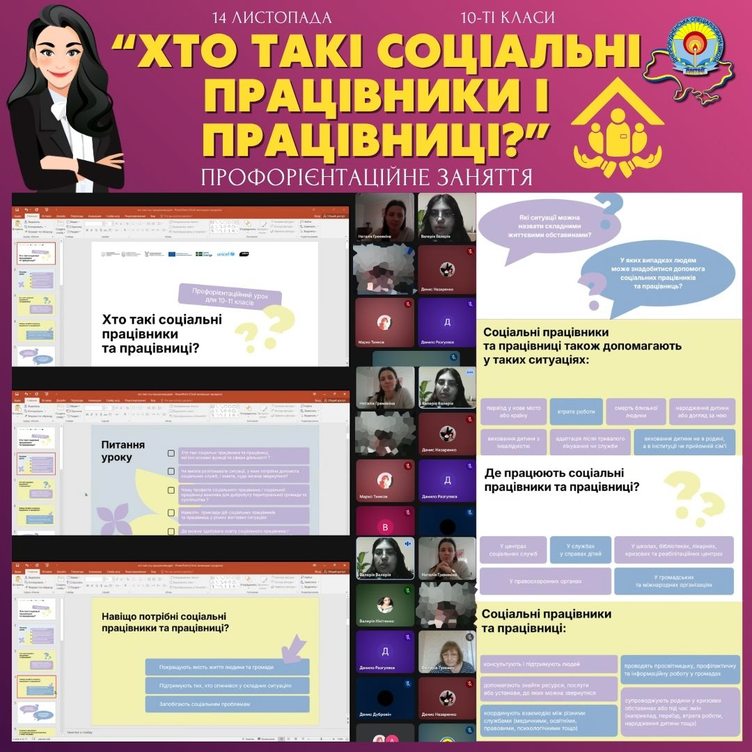 Сьогодні для учнів 10-х класів школи “Світоч” відбувся надзвичайно актуальний та мотивуючий профорієнтаційний урок під назвою “Хто такі соціальні працівники і працівниці?”.